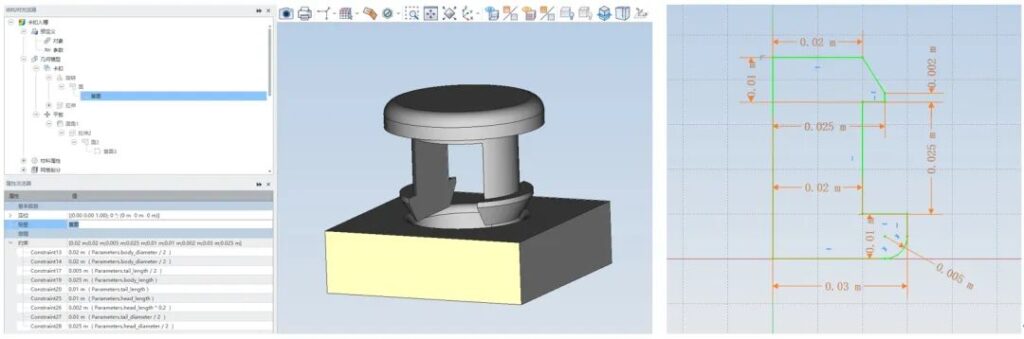 二、仿真APP解决方案 本文以圆头卡扣为例,介绍卡扣的分析过程和仿真APP制作方法,并基于仿真APP完成卡扣的尺寸设计。 1、仿真流程搭建 1)参数化建模。建立卡扣模型,将其关键设计尺寸参数化。