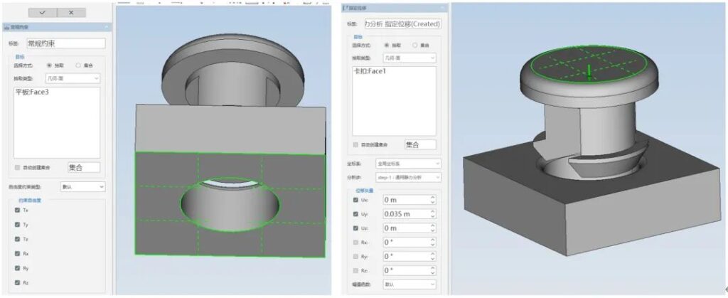 4)约束与载荷施加。将卡扣槽底面固定,在卡扣头顶面施加强制位移载荷。