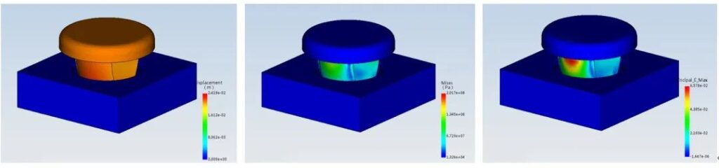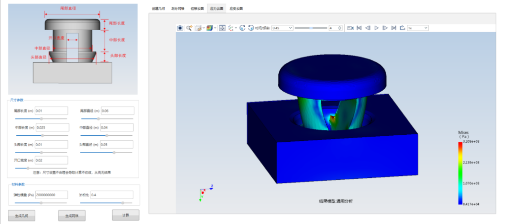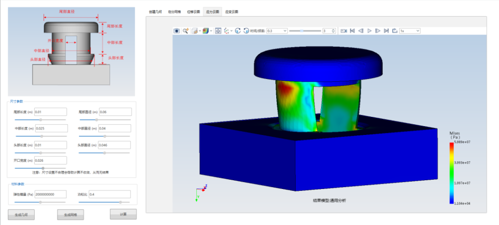 修改卡扣设计尺寸,如增大开口宽度,减小头部直径,重新提交进行计算。经过多次迭代,最终得到如下满足力学要求的尺寸参数。从APP的应力云图可以看出卡扣装配过程最大应力为60MPa,满足强度要求。