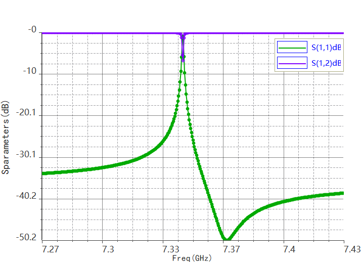 除了对谐振腔进行本征模分析,还可以利用伏图高频电磁场分析中的频域有限元方法对整个量子比特电路的传输线谐振器组件进行仿真,获取S参数数据,进而验证设计方案的可行性。下图展示了传输线的S参数,可以看到,在谐振腔谐振频率附近S11具备强谐振反射率,在远离谐振频率的位置具有高传输性。