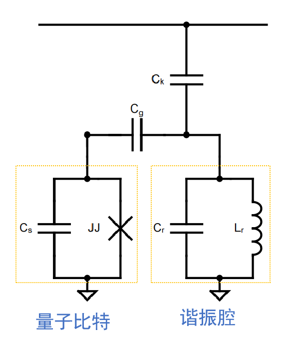 下图展示了一个量子比特电路的两个核心模块:量子比特和传输线谐振腔。这两个模块也是电荷量子比特Transmon和Xmon的基础单元。
